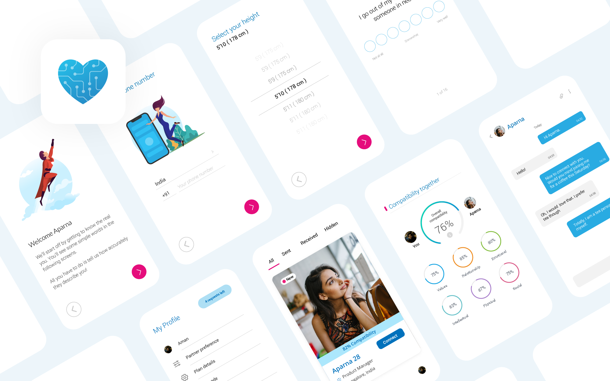 The translation of our brand philosophy into design started with the logo. Our old logo represents a story the we have used as our slogan - ‘Our AI finds your life-partner’ - the combination of heart and tech.