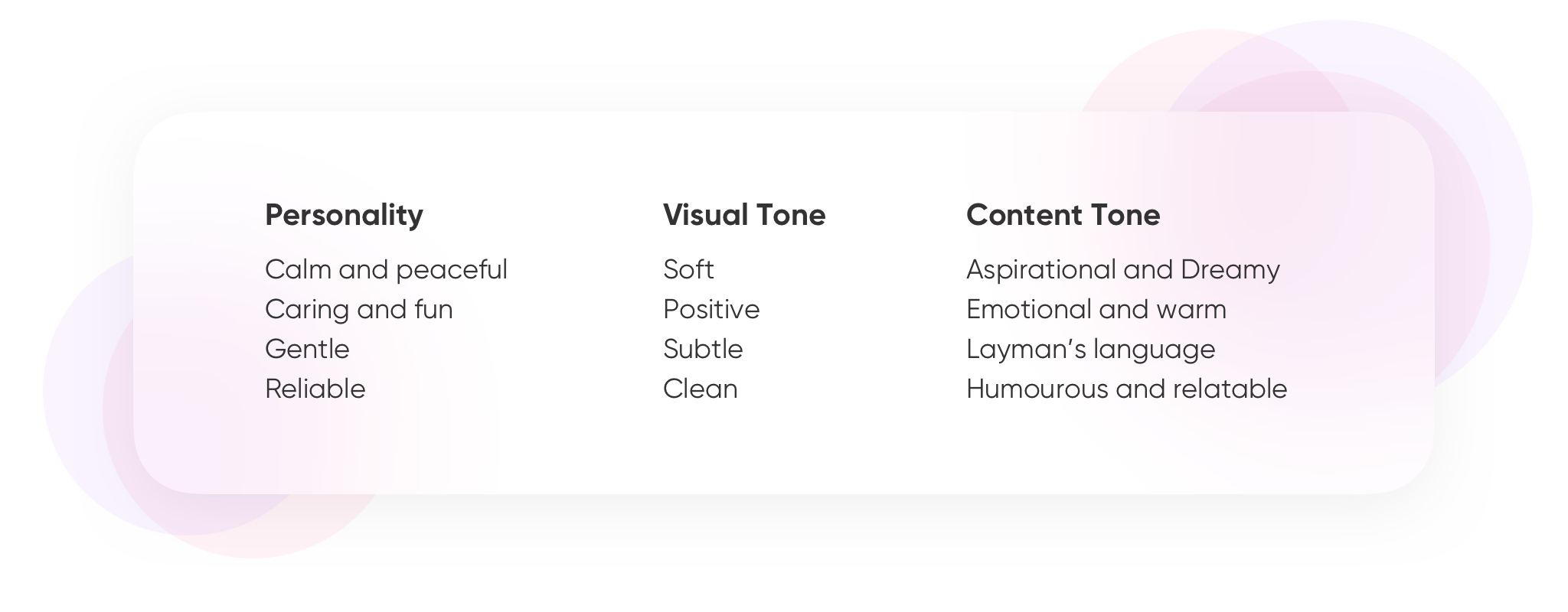 After getting the research insights, we started to connect the dots - started with finding out the brand attributes. We involved our teammates on this process and got a diverse set of insights from it. And this is how the attributes look like after we narrowed it down to four.
