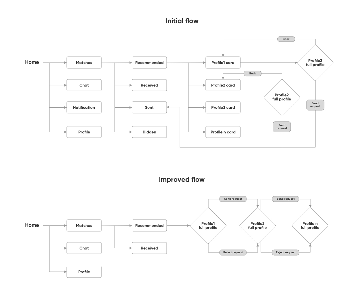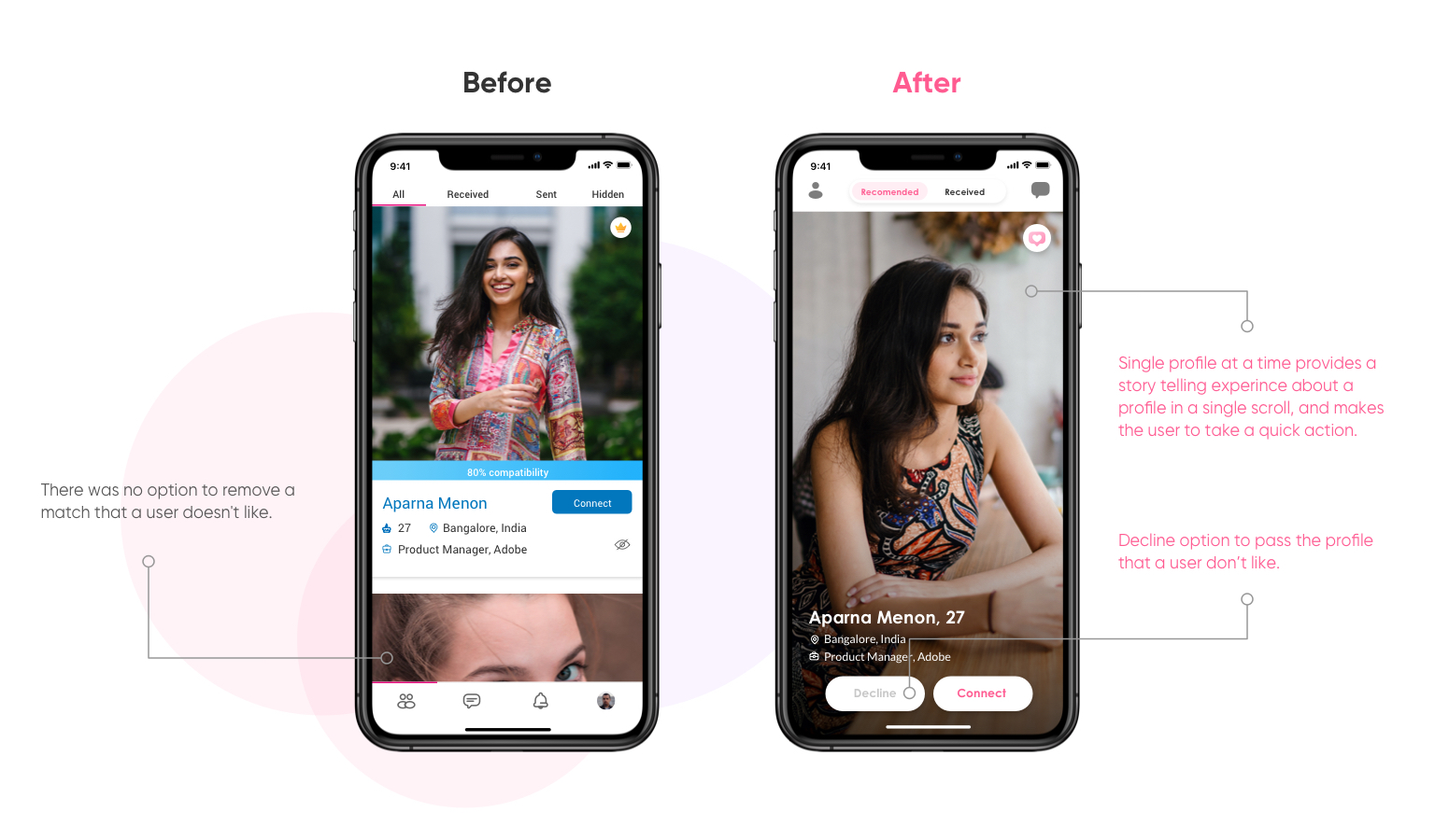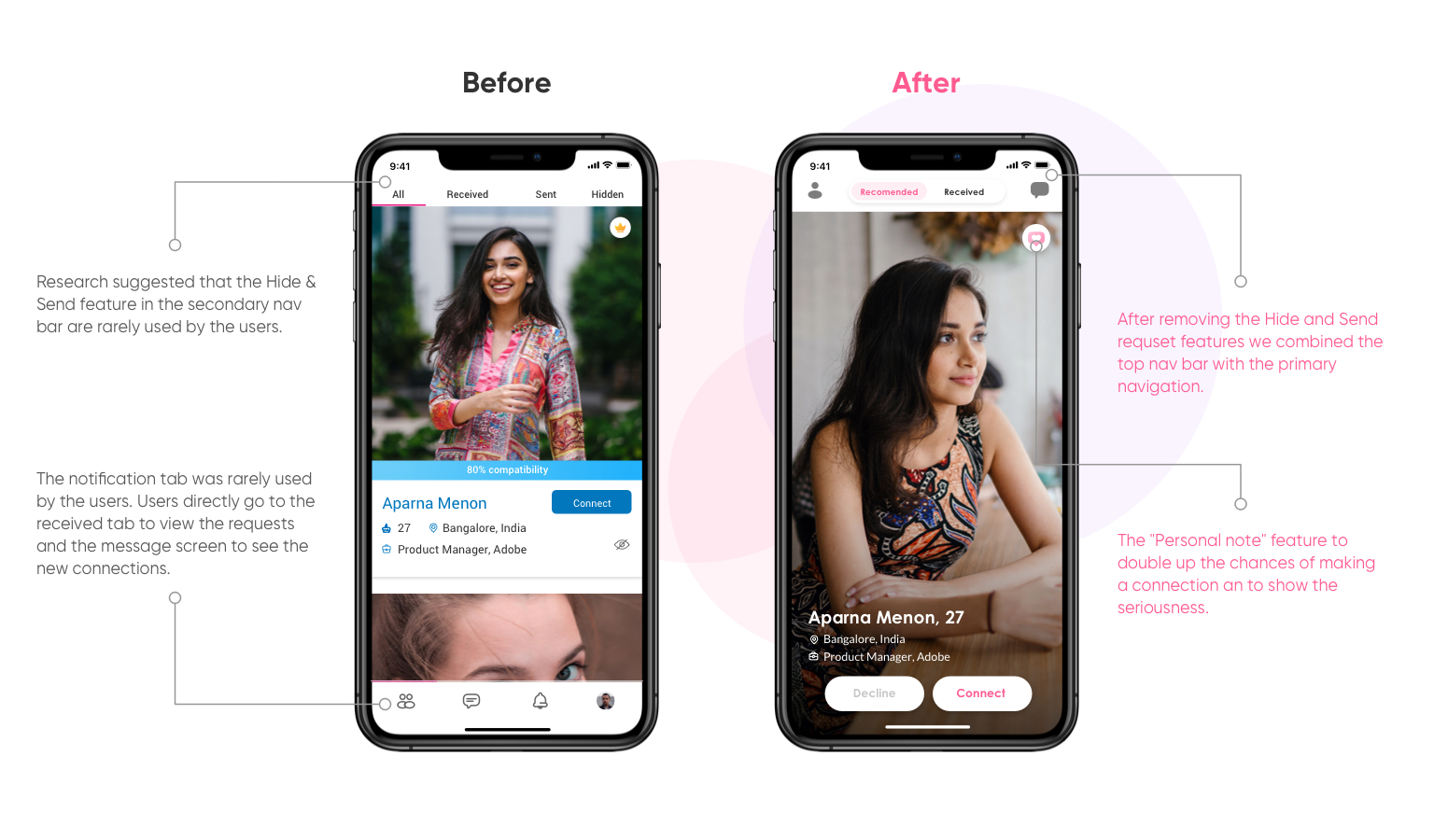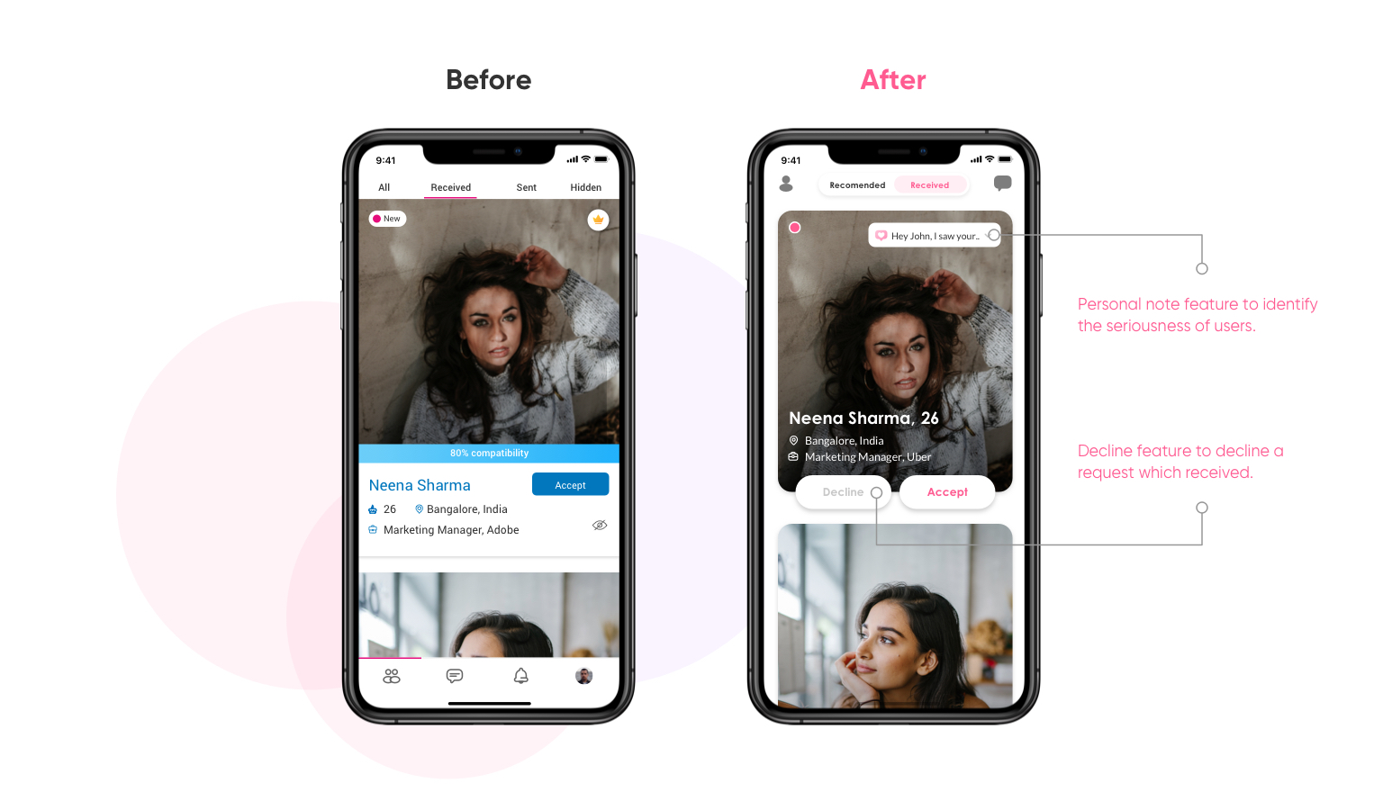 A simplified received request section with a decline button in every profile to reject a request. Also, the user can now differentiate the seriousness of a profile with the help of the personal note feature.
